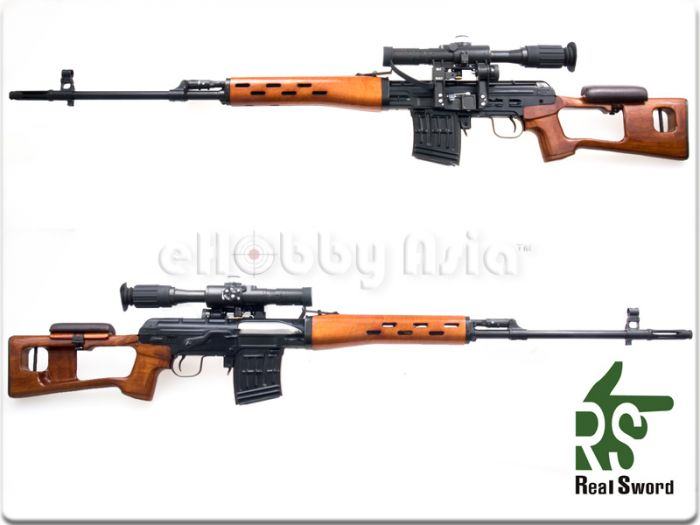 Real Sword SVD (Dragunov) airsoft replika. U airsoftu postoji mnogo proizvođača replika, ali samo je jedan Real Sword. Ovaj beskompromisni proizvođač proizvodi isključivo vrhunske replike, neusporedovo čvršće i trajnije od replika drugih proizvođača. A kako i ne bi, kad ih proizvodi od istih materijala, na isti način i u istim pogonima u kojima se proizvodi i pravo oružje. Rezultat je replika koju niti najstručnije oko ne može razlikovati od pravog oružja, niti izgledom, niti težinom, balansom, čvrstoćom i robusnošću. Tek pogled u unutrašnjost otkriva kako je riječ o airsoft replici !.