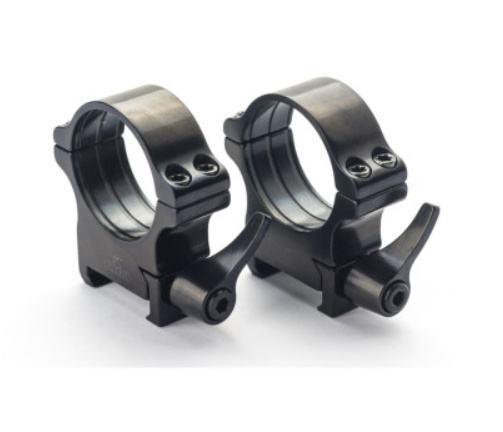 Ručica omogućuje vrlo brzo i učinkovito učvršćivanje ili skidanje optike, bilo u terenskim uvjetima, na streljani ili u lovištu – jednostavno zakreni, optika je spremna za izmjenu, čišćenje ili prijenos. Prstenovi su precizno izrađeni od izdržljive metalne legure, otporni na naprezanja, trzaje i duga izlaganja vanjskim utjecajima. Mat crna završna obrada sprječava neželjeni odsjaj te štiti od ogrebotina, korozije i vlage, što ih čini pogodnima za dugi vijek uporabe u svim uvjetima.
