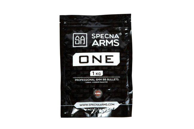 Specna Arms ONE airsoft BB kuglice 0.40g/1kg (2500kom) BIJELE. Kvalitetne airsoft kuglice renomiranog airsoft proizvođača Specna Arms. Baš kao i Specna Arms ONE serija airsoft replika, Specna Arms ONE airsoft kuglice predstavlja višu klasu kvalitete airsoft kuglica (između Core i Edge klase). Specna Arms ONE airsoft kuglice su polirane do visokog sjaja te presvučene zaštitnim slojem kako bi se umanjilo trenje u cijevi. Promjera su 5.95mm, uz preciznost +/-0.005mm. Zahvaljujući kvaliteti površine i preciznosti izrade, daju stabilan hopup efekt i visoku preciznost. Mogu se koristiti u standardnim i preciznim cijevima airsoft replika.