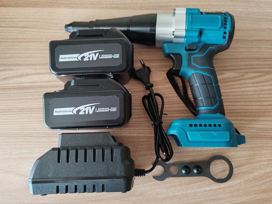 U kompletu aku kliješta, dvije baterije, punjač, ključ i kofer.