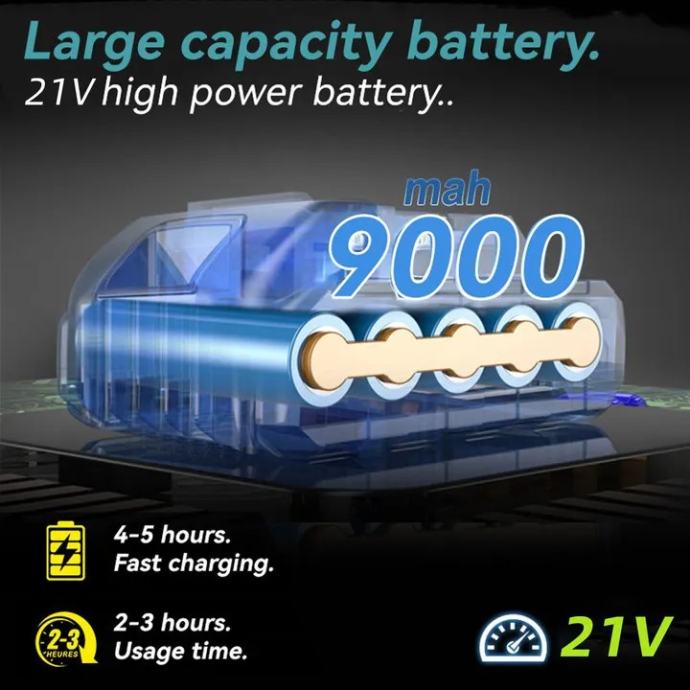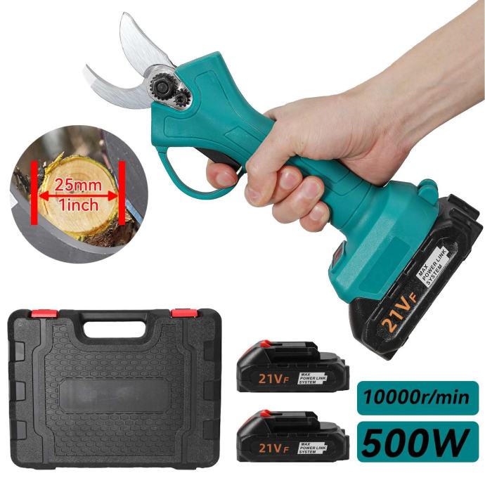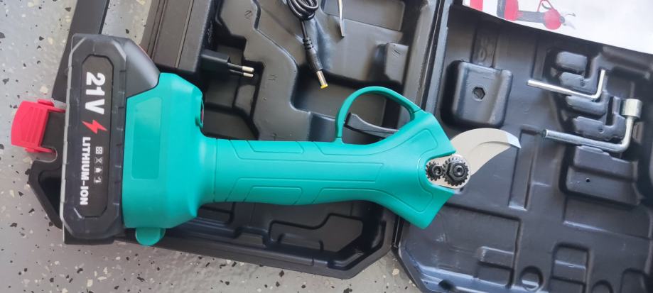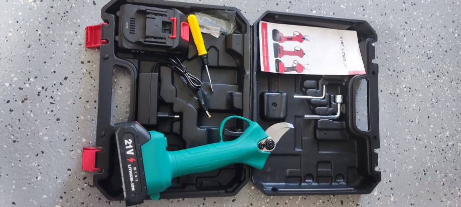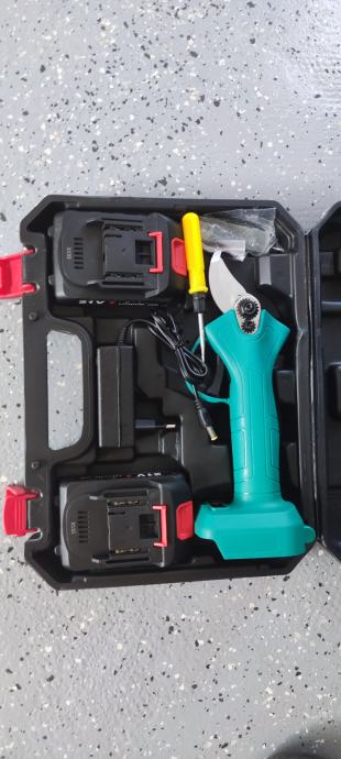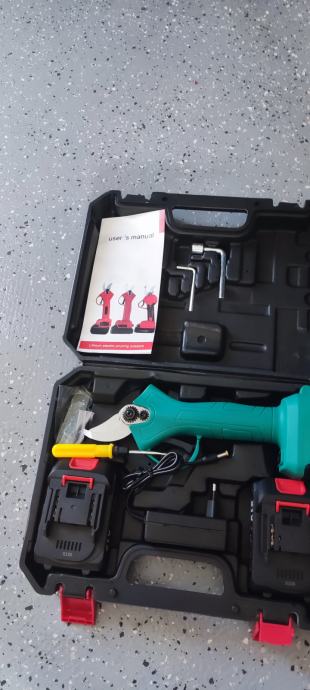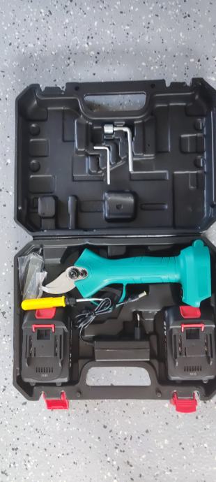 Set sadrži: aku škare, 2 kom. baterije, punjač,