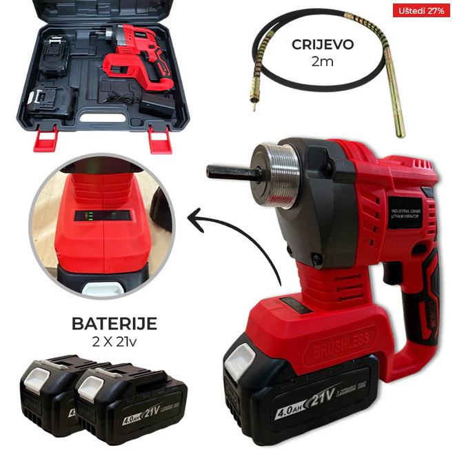 Profesionalni akumulatorski vibrator za beton s 21V baterijama osigurava učinkovito i brzo zbijanje betona, bez potrebe za električnim kablom. Idealno za rad na terenu, na teško dostupnim mjestima ili gdje nije dostupna mrežna struja.