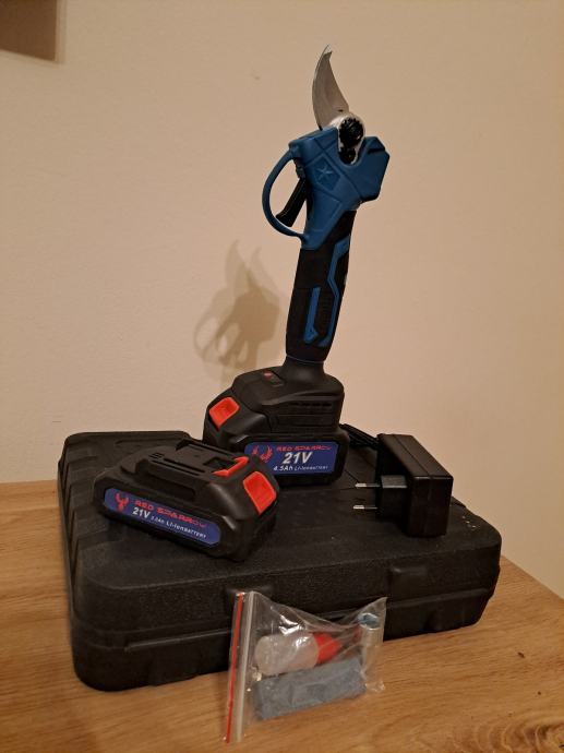 Prodajem nove akumulatorske škare za obrezivanje grana. Radi se o električnim škarama na bateriju, napona 21V. U kompletu dolaze dvije baterije (jedna 4,5aH, druga 3aH), punjač, ključ, kamen za oštrenje, upute za upotrebu, te kofer za odlaganje.