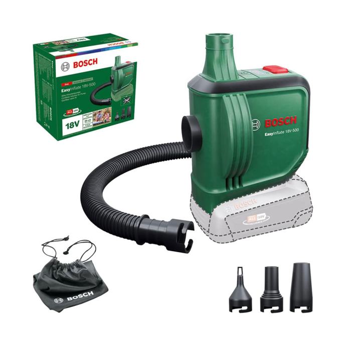 Opušteno napuhavanje velikih predmeta za napuhavanje. Maks. protok od 530 l/min omogućuje brzo napuhavanje madraca na napuhavanje, čamaca na napuhavanje i manjih bazena. Ima prekidač za uključivanje i isključivanje za automatsko napuhavanje i ispuhavanje, 3 sapnice i crijevo od 50 cm. Lagana je, kompaktna i jednostavno se prenosi, pa je praktična za upotrebu na otvorenom i u zatvorenim prostorima. Ispuhavanje se obavlja kroz jednostavni nastavak s otvorom za ispuhavanje. Kompatibilno s akumulatorom Bosch 18V POWER FOR ALL. Solo model – isporučuje se bez akumulatora i punjača