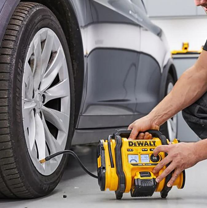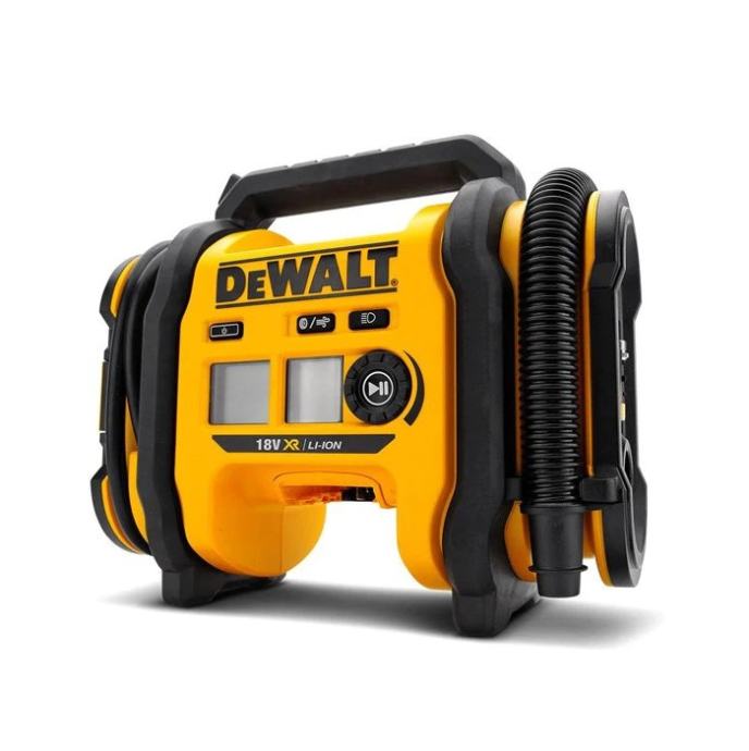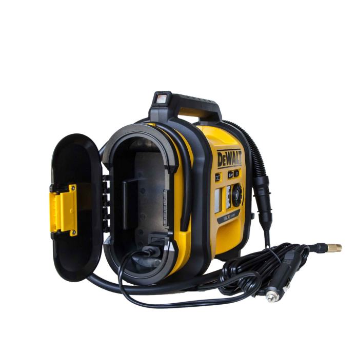 Kompaktni bezuljni kompresor DCC018N DeWALT može se napajati baterijama od 18 V iz linije XR ili iz utičnice za upaljač u automobilu od 12 V. Po želji se može napajati izravno iz električne mreže 230V. Ovo zahtijeva AC napajanje sa simbolom N557515, dostupno kao rezervni dio. Praktični kompresor nema spremnik, ali elektronika kojom se upravlja gumbom, prekidačima i LCD zaslonom omogućuje odabir radnih parametara za različite zadatke. Varijabilni radni tlak utječe na protok zraka što olakšava napuhavanje automobilskih guma i sportske opreme, a veća učinkovitost korištenjem šireg crijeva znači brzo napuhavanje i ispuhavanje pontona, madraca, igračaka. Više mjernih jedinica – bar, kPa, PSI za jednostavnu upotrebu i točnost razine tlaka Visoki maksimalni tlak - do 11 bara, 160 PSI, idealno za napuhavanje guma npr. veličine 235/70R17 u 400 sekundi Crijevo velikog kapaciteta s adapterom za brzo punjenje i pražnjenje pontona - praktična turistička upotreba Podesivi radni parametri - kapacitet 0,35 l/min sa 6,2 bara za napuhavanje ili 0,6 l/min na 2 bara za brzo napuhavanje Digitalni manometar s automatskim isključivanjem visokog tlaka - Mogućnost postavljanja željenog PSI i manometra za jednostavno korištenje i točnost Spremište pribora i crijeva – visokotlačni adapter, Presta adapter za bicikle i kuglasta igla, plus 12V utičnica za napajanje vozila 240V AC N557515 napajanje – dostupno kao rezervni dio, omogućuje vam napajanje iz električne mreže LED svjetlo – korisno osvjetljenje za pumpanje na tamnim mjestima Čvrsta konstrukcija – oprema prilagođena radu na terenu Napajanje: baterija 18V / mreža 230V (opcija) / auto 12V