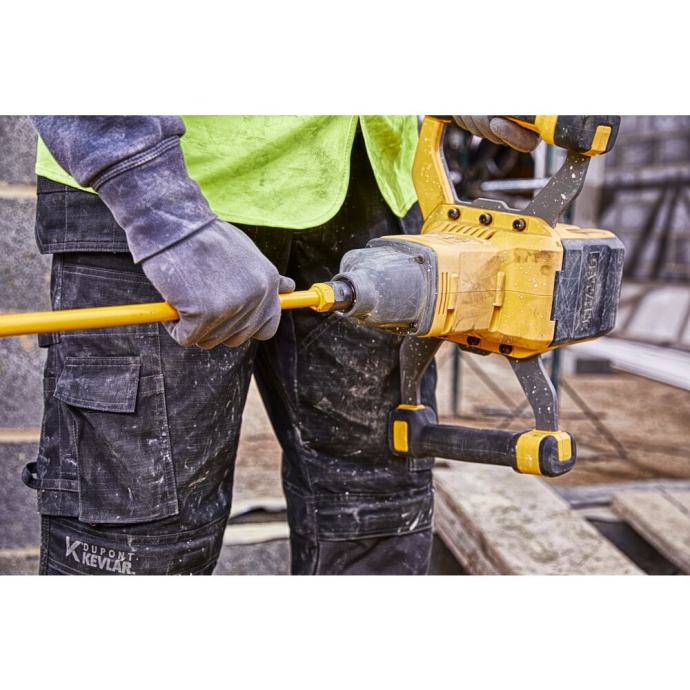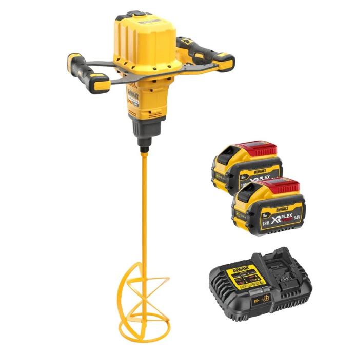 Aku miješalica za boju i ljepilo DCD240X2 DeWALT opremljena motorom bez četkica (2000 W) na 54 V iz FLEXVOLT baterije može miješati i najdeblje žbuke pomoću miješalice promjera 160 mm. Indukcijska tehnologija motora čini ga vrlo otpornim na preopterećenja i ima visok okretni moment čak i pri najnižim brzinama. Metalni jednobrzinski mjenjač čvrst je i učinkovit, a brzina se može podešavati peterostupanjskim gumbom i prekidačem koji se zaključava. Promjenom smjera vrtnje stvaraju se dodatne mogućnosti za rad i pranje radnog dijela. Klasični prihvat M14 omogućuje širok raspon korištenja s bilo kojim mikserom. X2 set uključuje višenaponski punjač i dvije 54V Li-Ion 3.0Ah baterije koje se mogu koristiti za DeWALT strojeve iz 18V XR linije, što im daje kapacitet do 9.0Ah.