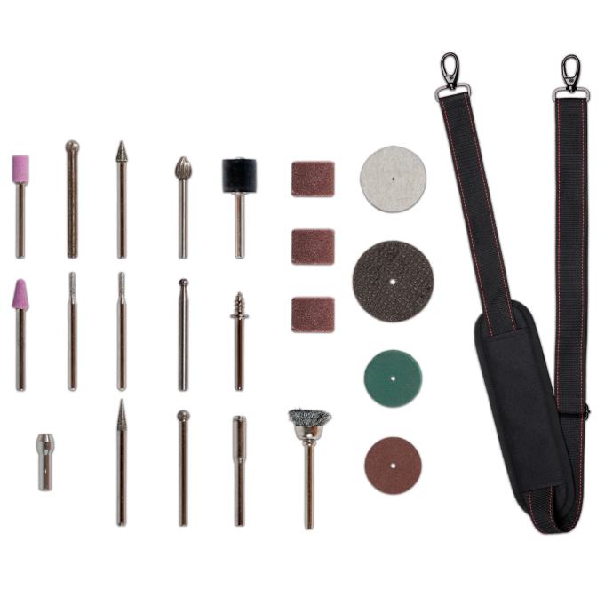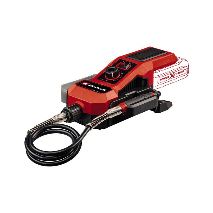 Einhell akumulatorski alat za brušenje i graviranje TE-MT 18/34 Li-Solo praktičan je pomoćnik za brojne zadatke kao što su graviranje, poliranje, glodanje, brušenje, rezanje i četkanje. Dio Einhell Power X-Change obitelji za brušenje i graviranje, gdje se sve baterije, punjači i uređaji sustava mogu fleksibilno kombinirati. Uz elektroniku za regulaciju brzine, broj okretaja od 5.000 do 34.000 o/min se može prilagoditi svakoj situaciji i bilo kojem materijalu. Gumb za zaključavanje omogućuje jednostavnu i udobnu promjenu alata. Precizni rezultati, čak i za detaljne zadatke ili složene gravure, mogući su zahvaljujući 92 cm dugoj, fleksibilnoj osovini. Alat za graviranje optimalno leži u ruci zahvaljujući svom uskom dizajnu i površinama s mekanim rukohvatom. Stanica uređaja za brušenje i graviranje opremljena je praktičnim držačem za alat, kao i držačem pribora za često korištene dodatke i odvojivom kutijom za pribor pričvršćenom na kućište. Ovisno o zadatku, stanica se može nositi izravno na tijelu s pomoću remena za nošenje dugačkog 150 cm, objesiti pomoću zidnog nosača radi uštede prostora ili sigurno postaviti zahvaljujući gumiranim nožicama. Isporuka također uključuje opsežan set nastavaka od 55 dijelova, s kojim jedva da postoje ograničenja za univerzalne primjene ovog alata. Akumulatorski alat za brušenje i graviranje TE-MT 18/34 Li-Solo isporučuje se bez baterije i punjača. Oni su dostupni odvojeno, npr. kao praktičan starter set. Solo model – isporučuje se bez akumulatora i punjača
