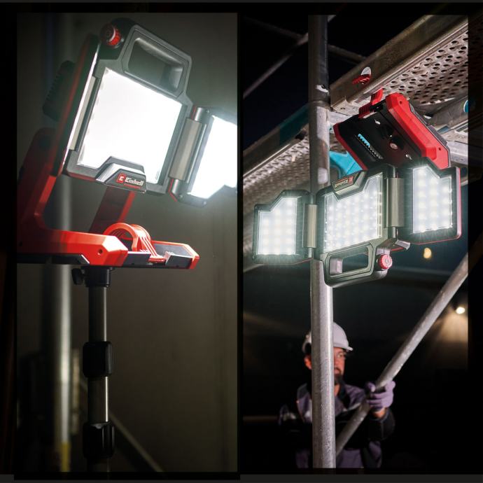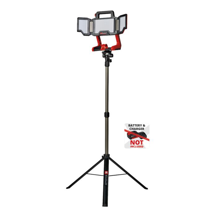 Einhell akumulatorska svjetiljka TP-CL 18/3000 Li Set-Solo donosi svjetlo u tamu, bilo na gradilištu, kada se koristi u radionici, garaži ili u vrtu. Set uključuje aku svjetiljku TP-CL 18/3000 Li i stativ. Snažna litij-ionska baterija iz inovativne obitelji Power X-Change osigurava optimalnu svjetlinu. Aku svjetiljka je član Power X-Change obitelji, što znači: svaka baterija se može kombinirati sa svakim uređajem iz ovog inteligentno dizajniranog sistema. Ukupno 60 snažnih i prigušivih LED dioda s ukupno 3000 lumena osiguravaju optimalno osvjetljenje, u svakom kutu. Einhell akumulatorska svjetiljka TP-CL 18/3000 Li izuzetno je fleksibilna zahvaljujući zakretnoj svjetlećoj glavi. Osim toga, dvije svjetlosne ploče s lijeve i desne strane mogu se podesiti tako da je moguće osvjetljenje velike površine do 270°. Neutralna bijela boja svjetla od 5700 K osigurava snažno osvjetljenje. Aku svjetiljka je prenosiva i praktična zahvaljujući integriranoj ručki za nošenje s mekom površinom za držanje. Zahvaljujući brojnim mogućnostima pričvršćivanja pomoću integriranih ušica ili kuke za pričvršćivanje, nema ograničenja za univerzalnu upotrebu. Visokokvalitetni stativ izrađen od robusnog aluminija savršen je dodatak za vaše gradilište. Sve svjetiljke ili uređaji koji su opremljeni navojem od 5/8" mogu se pričvrstiti na stativ, poput Einhell aku svjetiljke TP-CL 18/3000 Li. Pomoću priloženog adapterskog navoja 1/4", ostala oprema, kao što su Einhell laserski križni nivelatori TC-LL 2 i TE-LL 360, također se može pričvrstiti na stativ. Teleskopska šipka stativa može se produžiti s radne visine od 85 cm na visinu od 170 cm. Zahvaljujući transportnoj visini od 70 cm, stativ se može pohraniti i transportirati radi uštede prostora. Pomoću integriranog vijčanog spoja s brzim stezanjem, noge i teleskopska šipka mogu se brzo i jednostavno izvući i fiksirati. Kvalitetne plastične kapice s rebrastom potpornom površinom na nogama stativa omogućuju stabilan i neklizajući stalak. Isporuka ne uključuje bateriju i punjač. Oni su dostupni zasebno, na primjer kao praktični PXC Starter Kit. Solo model – isporučuje se bez akumulatora i punjača