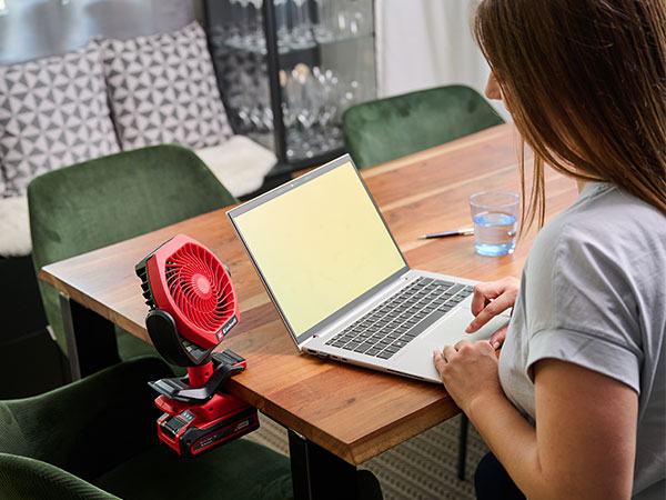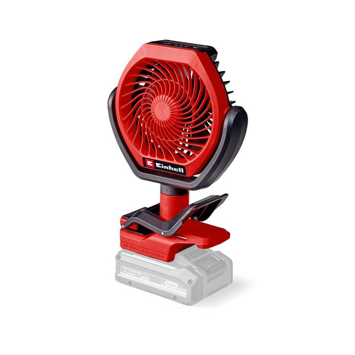 Einhell akumulatorski ventilator GC-CF 18/110 Li-Solo donosi dašak svježeg zraka. Bežični uređaj može se koristiti bilo gdje i osigurava protok zraka u svakom trenutku. Ventilator je član Power X-Change obitelji. Uređaj pokreće Einhell PurePOWER motor bez četkica. Ovaj motor bez četkica nudi veću snagu i dulje vrijeme rada od tradicionalnih motora s karbonskim četkicama. Nakon online registracije, na motor bez četkica vrijedi 10 godina jamstva. Kompaktan i prijenosni akumulatorski ventilator namijenjen je za vanjsku i unutarnju upotrebu. Zahvaljujući gumiranoj pričvrsnoj kopči, ventilator se može pričvrstiti na stolove, cijevi, prozorske klupice itd. na stabilan način. To znači da se može koristiti univerzalno – bilo na terasi ili balkonu, u radnoj sobi, kuhinji ili u radionici. Ventilator se također može pomicati po dvije osi: na donjoj osi se ventilator može zakrenuti za ukupno 300° u oba smjera, dok se na glavi ventilatora može naginjati do 290°. Postavke su neograničene. Postoje tri razine za podešavanje protoka zraka. Brzina protoka zraka od 15 km/h generirana je uz promjer ventilatora O 110 mm. GC-CF 18/110 Li-Solo akumulatorski ventilator isporučuje se bez baterije i punjača. Oni su dostupni zasebno. Solo model – isporučuje se bez akumulatora i punjača