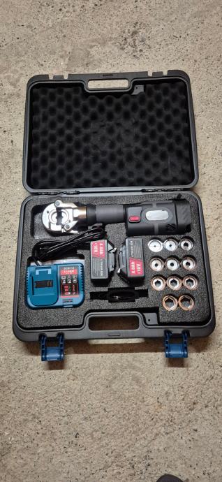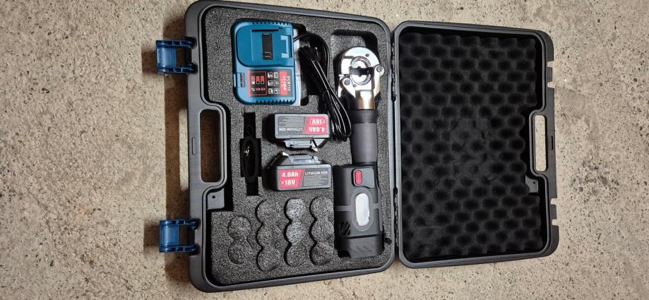 Električni hidraulični klješta 10-300mm2 za električare sa 12 pari šesterokutnih čeljusti, za aluminijske i bakrene kabele. Elektrohidraulički stroj za presanje kabela ima matrice za presanje od 10 do 300 mm², tako da možete obrađivati različite bakrene i aluminijske kabele s visokom preciznošću. Matrice za prešanje dostupne su u promjerima 10, 16, 25, 35, 50, 70, 95, 120, 150, 185, 240 i 300 mm². Snažne performanse: snažan motor osigurava brzo i učinkovito prešanje crijeva. Litij-ionska baterija visokog kapaciteta s kratkim vremenom punjenja. LED diode osvjetljavaju radno područje za jednostavnu upotrebu u tamnim područjima. Funkcija automatskog uvlačenja osigurava precizan i siguran rad. Stezaljka se može rotirati za 360°. Uređaje je novi, nije korišten. Kompletno sa koferom, 2 baterije, punjačem.