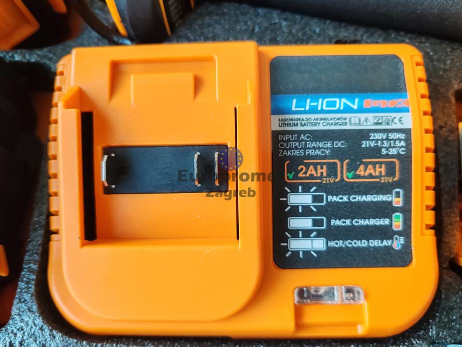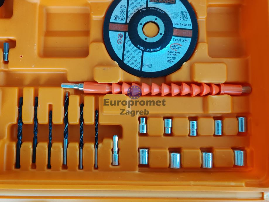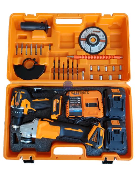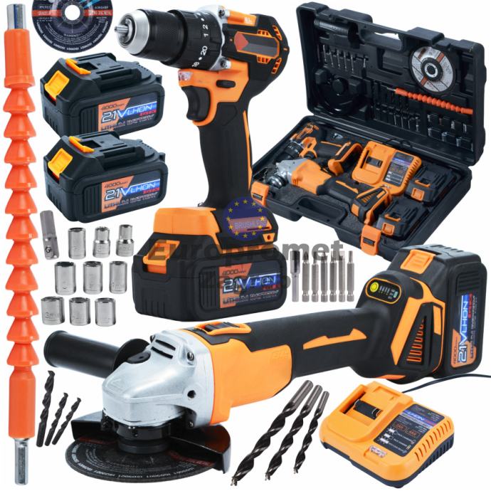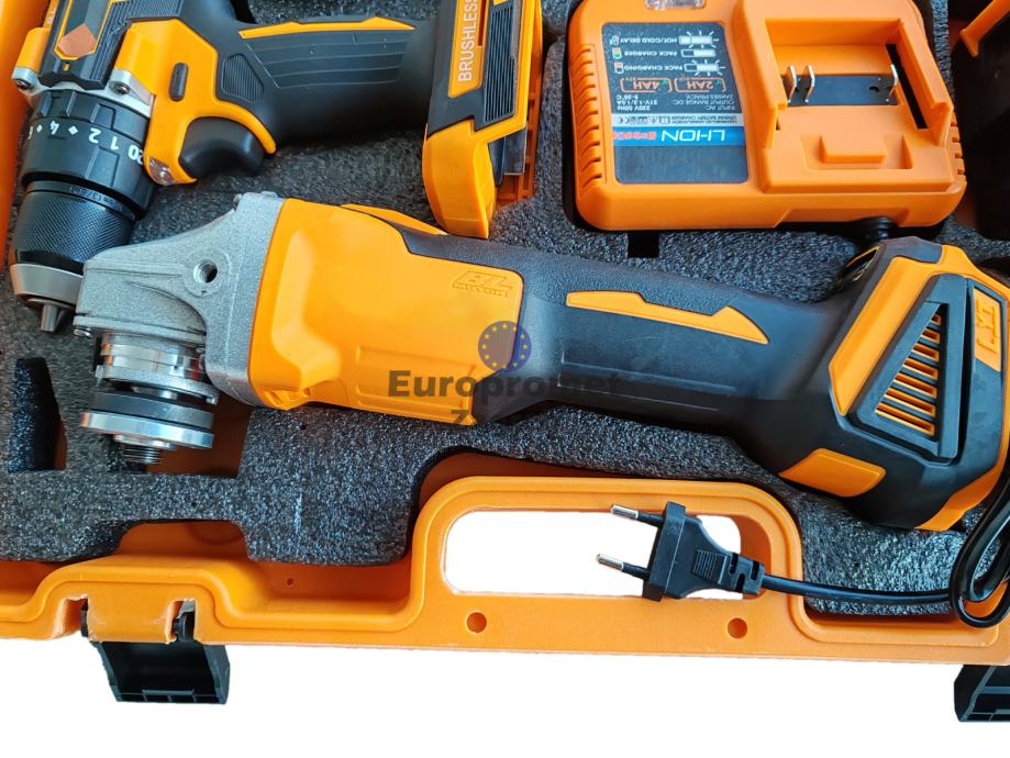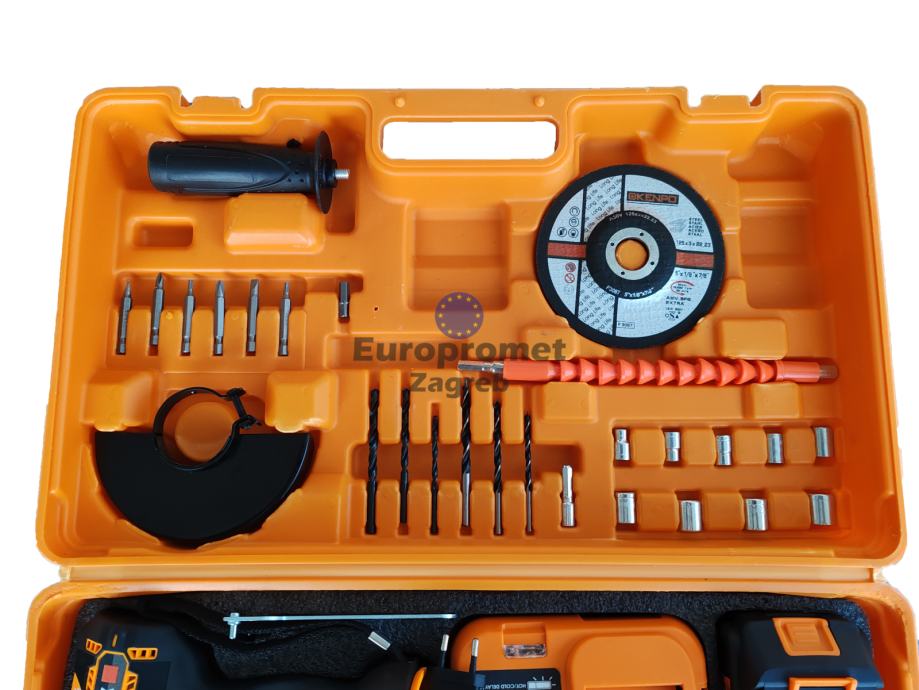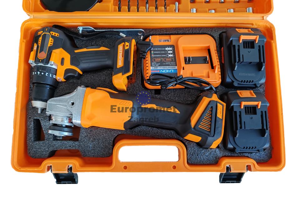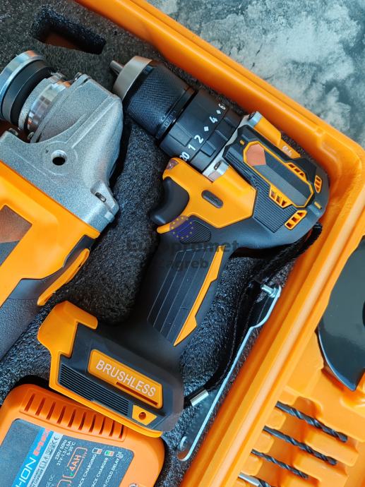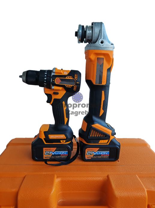 Set brusilica i bušilica sa dvije baterije punjačem i setom alata sve u koferu. Top cijena 89.99 eura. Alati bez četkica, nova generacija alata.