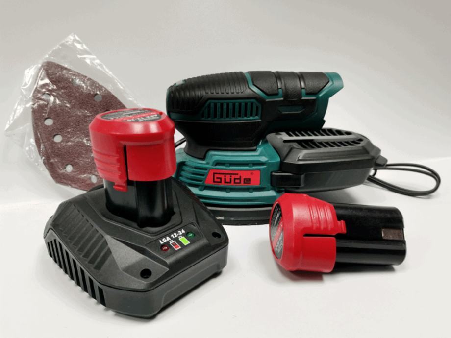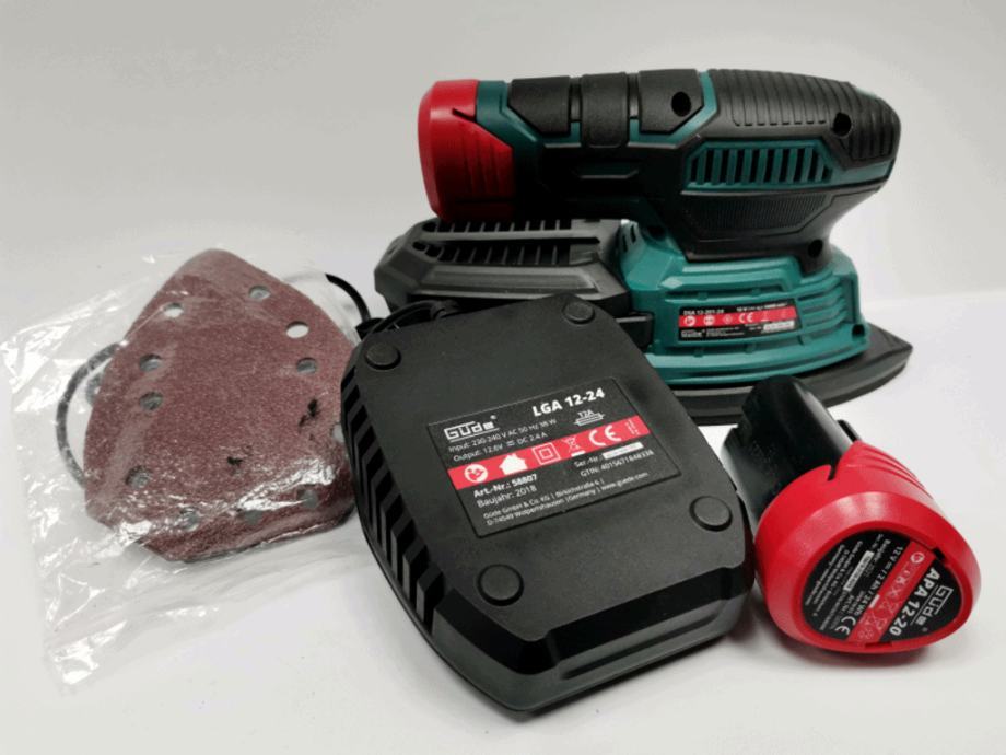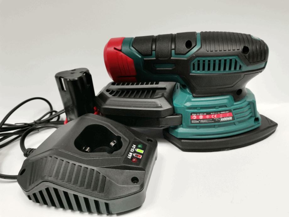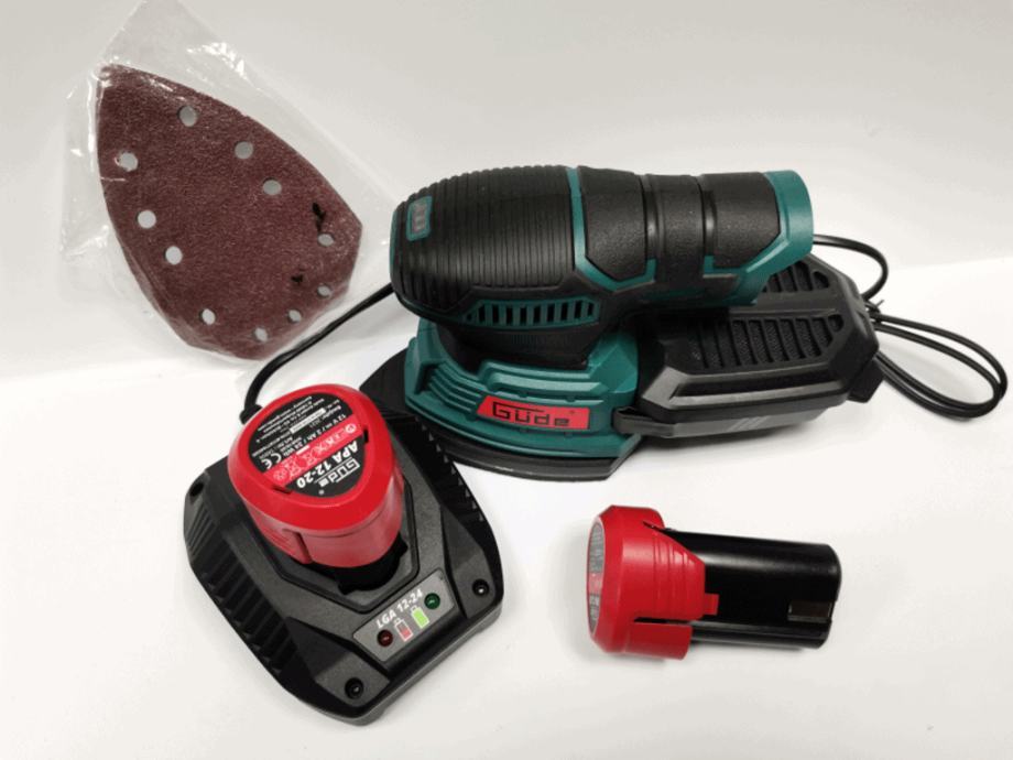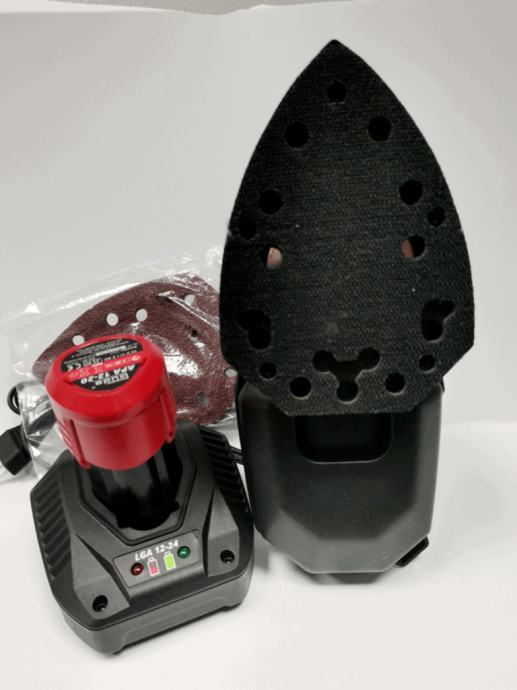komplet se sastoji od aku delta brusilice,brzog punjača,2 baterije te seta brusnog papira