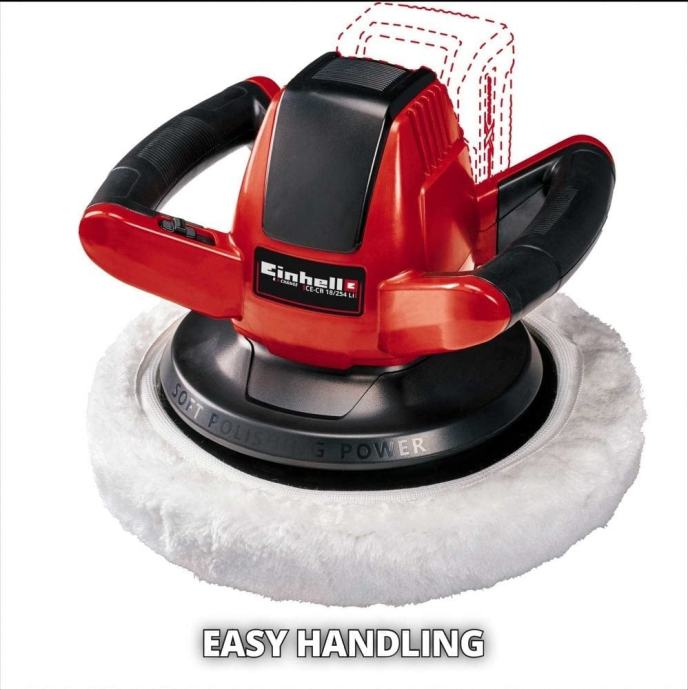 Einhell CE-CB 18/254 Li akumulatorska polirka idealan je alat za brzo poliranje automobila. Tajna odličnog rezultata poliranja: fleksibilnost i sloboda upravljanja kod rada. Ergonomski izrađeno kućište uz korištenje "soft grip" tehnologije idealno leži u ruci. Promjer presvlake od 254 mm i 2500 okretaja u minuti čini Einhell CE-CB 18/254 Li akumulatorsku polirku idealnim alatom za uljepšavanje vozila. Za sigurnost korištenja, ON/OFF prekidač je lako dostupan, te je ugrađen prekidač protiv preopterećenja. Korištenje polirke je vrlo jednostavno. Na površinu se prvo, tekstilnom presvlakom raspoređuje sredstvo za poliranje te se na kraju sintetičkom presvlakom ulašti površina laka.