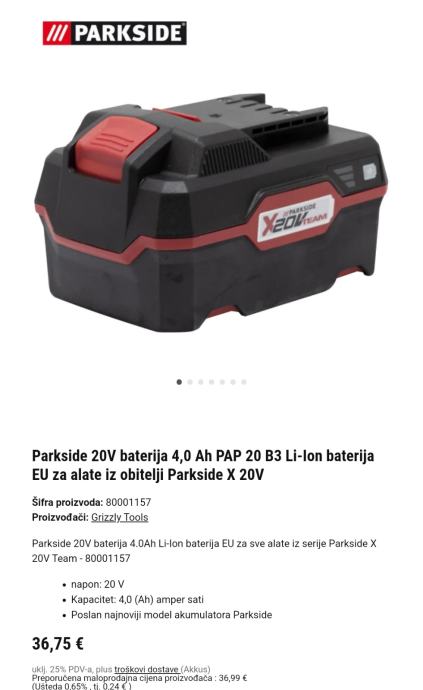 Aparat je nov, neupotrebljavan, s 3 godine garancije. U paketu je i punjač PLG 20 C3 i baterija PAP 20 B3 4.0Ah. Punjač i baterija ako ih posebno nabavljamo dođu cca 60€.