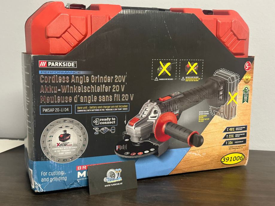 PARKSIDE PERFORMANCE 20 V akumulatorska kutna brusilica “PWSAP 20 Li D4” savršen je suputnik za sve koji traže pouzdan alat za rezanje i brušenje metala, betona ili pločica. Sa svojim motorom bez četkica, nudi posebno dug radni vijek zbog manjeg trošenja, a gumirano kućište s robusnom aluminijskom prednjom stranom i prednjom ručkom u 3 položaja osigurava neklizajuće značajke mekog rukohvata i optimalno podešavanje putem aplikacije PARKSIDE (samo s X20V- PAPS-SMART baterije). Akumulatorska kutna brusilica ima podesivu brzinu i brzo podešavanje zaštitnog poklopca bez alata, dok blokada vretena olakšava promjenu diska.