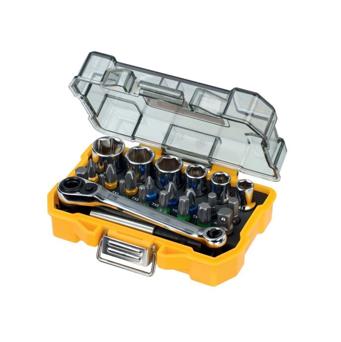 DT71516 set sadrži 24 dijela: • Bitovi od 25 mm: Ph1, Ph2, Ph3, Pz1, Pz2, Pz3, T10, T15, T20, T25, T40, • Bitovi od 25 mm: Hex 4, Hex 5, Hex 6, • ključevi 1/4": 6, 7, 8, 10, 11, 13 mm • magnetni nastavak za bitove 1/4" (6,35 mm) 1x, čegrtaljka 1/4" • čegrtaljka 1/4"