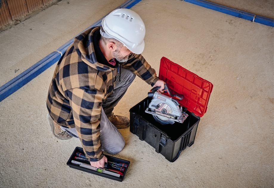 Einhell E-Case M je član modularnog E-Case sustava. Kovčeg je idealan za skladištenje i transport strojeva i alata. Praktičan sustav zaključavanja za spajanje naslaganih kovčega osigurava sustavan red tijekom skladištenja i omogućava siguran transport. Kućište je izrađeno od polipropilena i stoga ima visoku čvrstoću, otpornost na toplinu i otpornost na udarce. Zahvaljujući svojoj unutarnjoj visini od 25 cm, E-Case M je prikladan za spremanje velikih Einhell alata kao što su ručne kružne pile, čekić bušilice ili blanje. Osim toga, kućište je zaštićeno od prskanja zahvaljujući svom inteligentnom dizajnu. Sklopiva i ergonomska ručka osigurava optimalnu udobnost nošenja, primjerice prilikom vađenja iz prtljažnika. Kutija E-Case M može biti opremljena lokotom za osiguranje od krađe. U opseg isporuke uključen je i odvojivi umetak za ručne alate i naljepnice za označavanje, tako da uvijek znate što je u kovčegu.