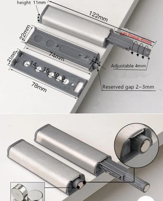 Opis: Push mehanizam za otvaranje vrata, ladica,...Visoka kvaliteta izrade, otporan na koroziju, dugotrajan, magnetni vrh.