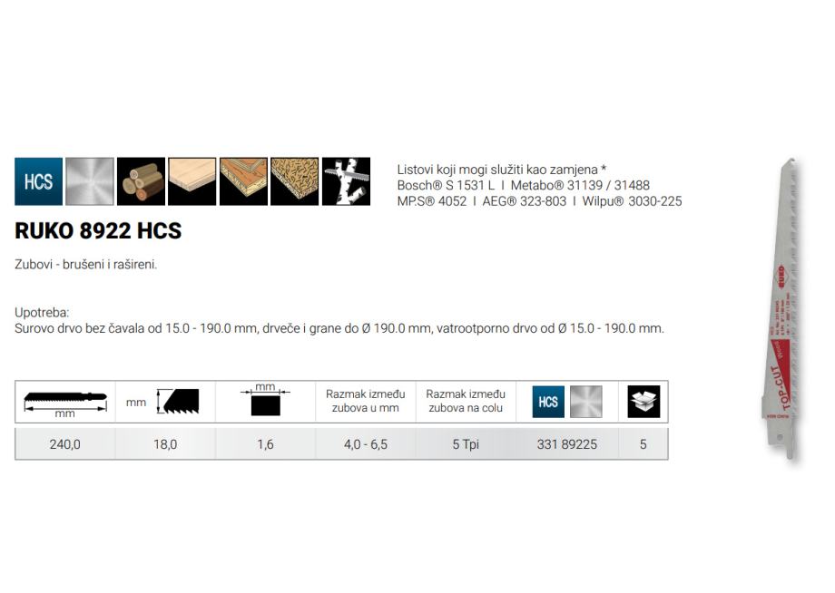 Područje primjene: Konstrukcijsko drvo, šperploča i plastika od 6,0 - 100,0 mm, drveni zid do 75,0 mm, iverica i MDF od 6,0 - 60,0 mm. Posebno pogodan za rezove uronom.