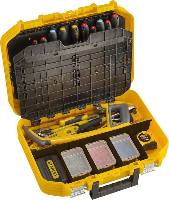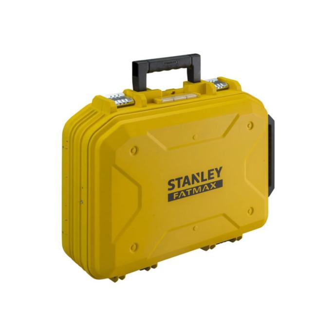 STANLEY FATMAX kofer dizajniran je s višerazinskom preklopnom strukturom koja omogućuje bolju preglednost i pristup alatu. Donji pretinac za pohranu može se prilagoditi pomoću uklonjivih pregrada i sadrži tri posude s poklopcima za fleksibilnu organizaciju. Kućište je izrađeno od staklenim vlaknima ojačane konstrukcije, što osigurava izdržljivost i zaštitu. Kofer je opremljen otvorom za lokot radi dodatne sigurnosti te ima stabilizacijske noge koje sprječavaju prevrtanje. Za udobnost prilikom nošenja, kofer je opremljen debelom ručkom premazanom gumom koja osigurava čvrst i ugodan hvat. Robusne metalne kopče osiguravaju dugovječnost, a ukupni kapacitet nosivosti je 30 kg.