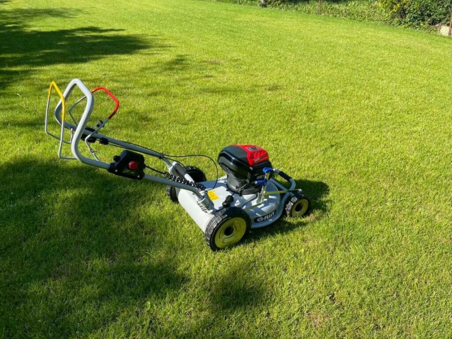 Zgrajen na preverjeni šasiji Grin, s standardnim ZAŠČITNIM STOŽCEM MOTORJA, je opremljen z 1,5 KW elektromotorjem, ki zagotavlja neverjetno zmogljivost v visoki travi in težkih pogojih, podobno kot stroj z motorjem z notranjim zgorevanjem.