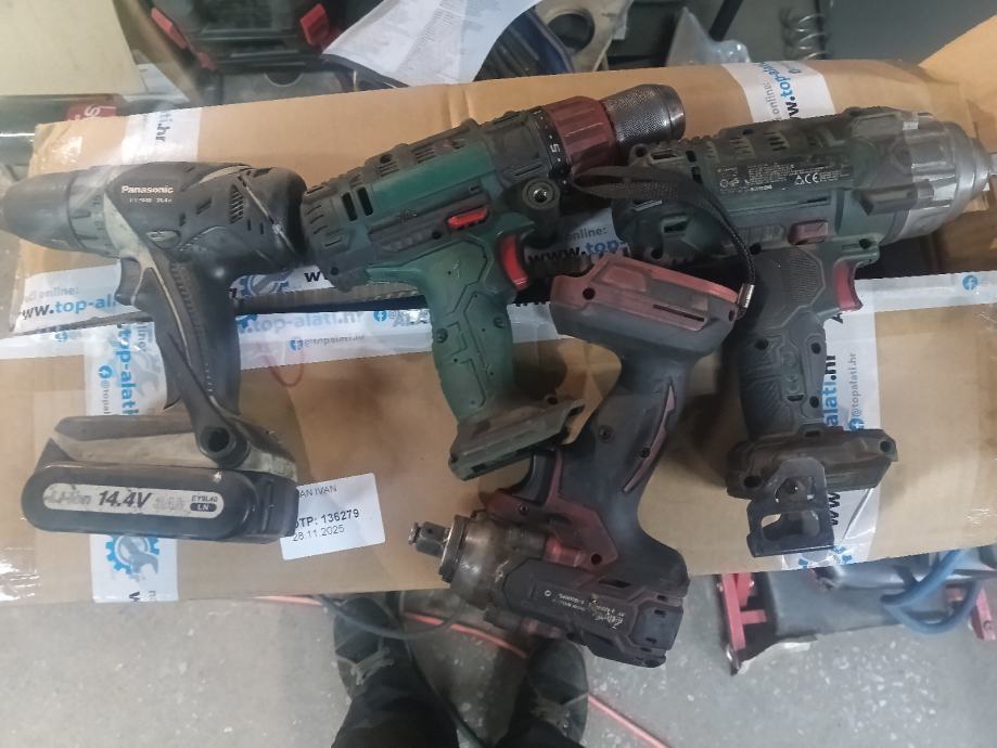Parkside su neispravni,pištolj za odvijanje vijaka je kratko radio,kopija makite radi al oslabila,Panasonic baterije ne valjaju,panasonic ima baterije i punjač