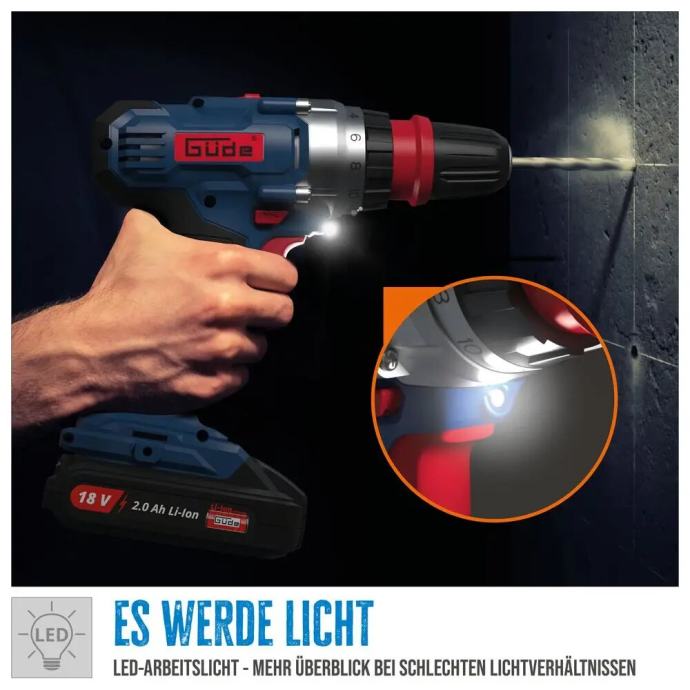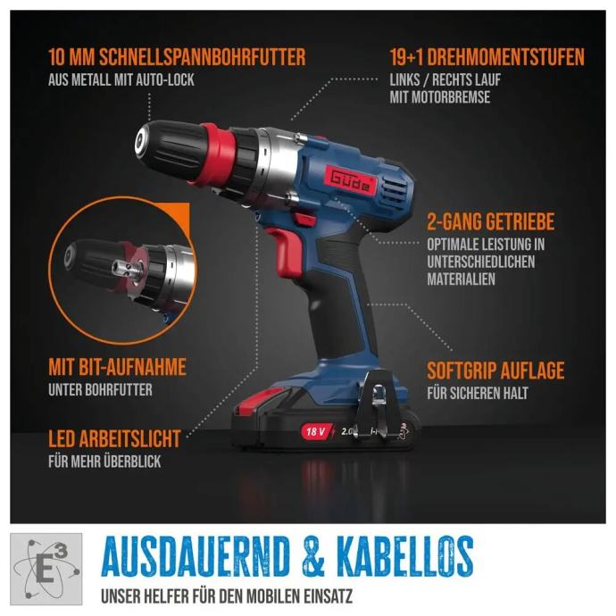 Zahvaljujući snažnoj litij-ionskoj bateriji od 18 V / 2,0 Ah i brzom punjaču uključenom u opseg isporuke, odmah ste spremni za rad. Iznimno kompaktna, ali moćna bušilica/odvijač savršeno leži u ruci i jamči vam rad bez zamora, čak i tijekom duljeg vremenskog razdoblja. Zahvaljujući robusnom 2-brzinskom mjenjaču i 19+1 podesivim razinama zakretnog momenta, čak ni zahtjevni zadaci nisu izazov za nju. Stezna glava za bušenje bez ključa može se ukloniti brzim pokretom pomoću zatvarača za brzo otpuštanje. Na ovaj način svoj uređaj možete u trenu pretvoriti u mali odvijač.
