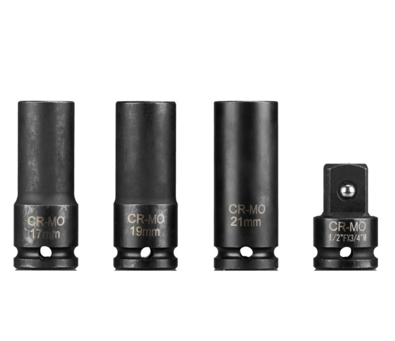Pribor: 3 x utičnice (1/2" utičnica, 17 - 19 - 21 mm; duljina 75 mm), 1 x adapter 1/2 inča na 3/4 inča