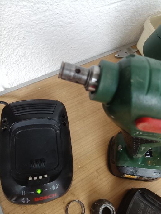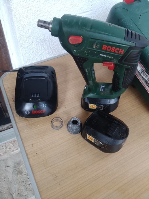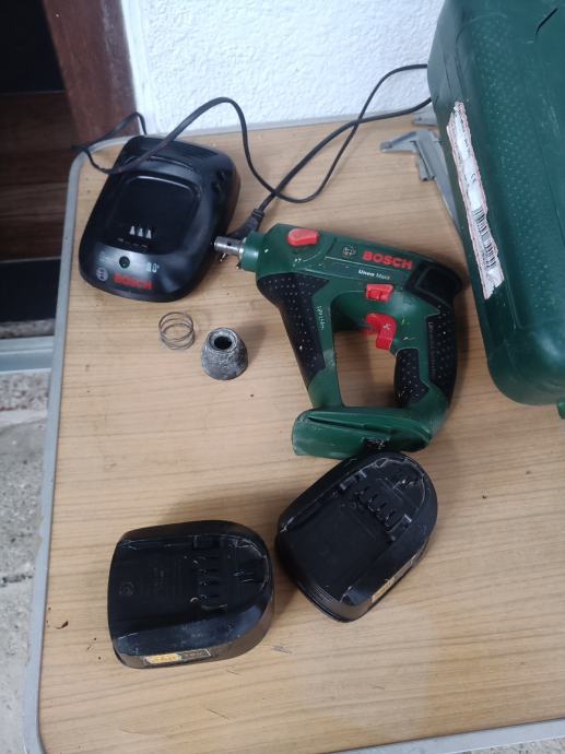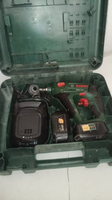 Busilica sds BOSCH uneo max sa dvije dobre baterije i punjacem. Busilica radi al treba promjenit glavu za svrdla. Moze se koristit samo za bitove koji idu u utor osovine komplet 50e