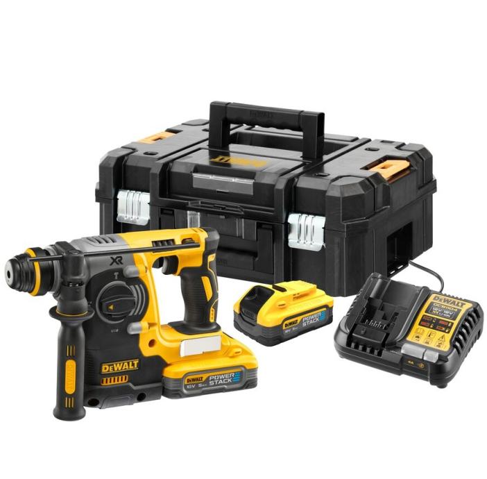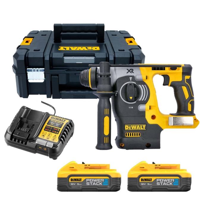 Obujam isporuke: DeWalt aku bušači čekić DCH273 DeWalt 2 akumulatora 5,0Ah DCBP518 Powerstack - Jamstvo na baterije 3 godine (uz produljenje) DeWalt punjač T-stack kofer, kopča za pojas, bočna ručka