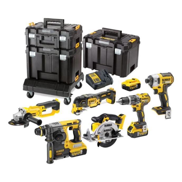 Set akumulatorskih alata koji sadrži aku udarnu bušilicu DCD796, aku udarni odvijač DCF887, aku višenamjenski alat DCS355, aku kutnu brusilicu DCG412, aku ručnu kružnu pilu DCS391, aku bušeći čekić DCH273, 3 akumulatora 5,0Ah i punjač, u TSTAK kovčezima.