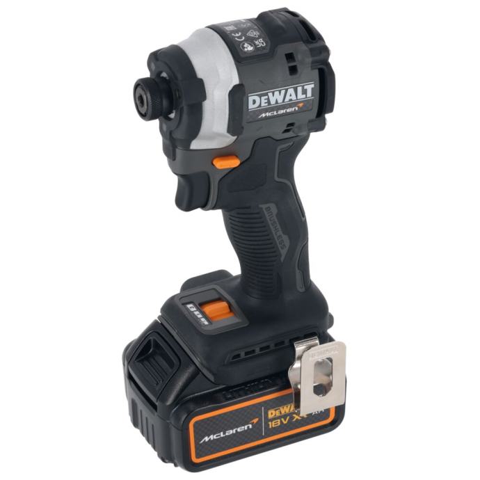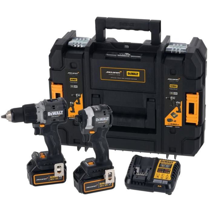 Aku bušilica: DCD85 je profesionalna aku bušilica koja se u ovom setu isporučuje s dva akumulatora kapaciteta 4,0Ah i brzim punjačem. Ovo je limitirana serija – izdanje McLaren F1 Team u crnoj boji s dodatnom zaštitiom od kemikalija i masti. Projektirana za profesionalnu izvedbu brushless udarna bušilica isporučuje snagu i brzinu potrebnu za teške primjene bušenja i pričvršćivanja. Svakako možemo reći da je jedan od jačih modela iz DeWalt asortimana. (90Nm) DCD85 je naša najnovija i najsnažnija dvobrzinska udarna bušilica – odvijač bez četkica koji isporučuje do 90 Nm okretnog momenta u kompaktnom tijelu od 177 mm, dizajniran da vam pruži najbolje performanse na najtežim poslovima. 2 brzine i 15 postavki okretnog momenta daju vam vrhunsku kontrolu pri bušenju i zavrtanju. Ova lagana, dobro uravnotežena bušilica/odvijač napravljena je kompaktno kako bi korisnicima omogućila udoban rad u skučenim prostorima tijekom duljeg vremenskog razdoblja. Okretna LED lampica s 3 položaja dizajnirana je za poboljšanje vidljivosti u slabo osvijetljenim radnim područjima sa svoja 3 načina rada i do 70 lumena svjetline. Baterija: 18 V, XR Li-Ion