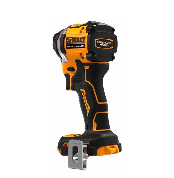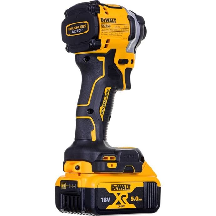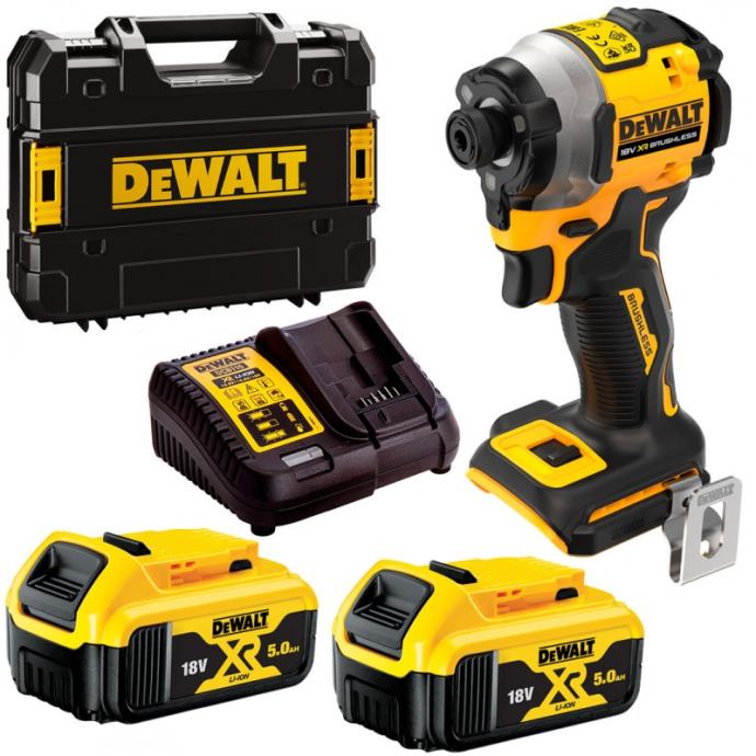 Udarni odvijač DCF850P2T je profesionalni odvijač opremljen motorom bez četkica velike snage s okretnim momentom od 205Nm. Isporuka je u plastičnom koferu s dva akumulatora kapaciteta 5,0Ah i punjačem. Kod ovog udarnog odvijača glavna značajka naspram ostalih je izrazito mali (kompaktni) dizajn. Iz tih razloga će koristan u skučenim prostorima. Tijelo alata je širine samo 10cm. Kompatibilan je sa svim baterijama oznake XR. Precision Drive - poboljšana kontrola koja zaustavlja oštećenje materijala i bita u poslovima manjeg obujma. LED lampica za bolje osvjetljenje kod uvjeta smanjene vidljivosti. Kompaktan dizajn s malom težinom od 0,90kg i 3 postavke brzine motora čine ovaj Dewaltov udarni odvijač odličnim izborom. – Napon: 18V – Snaga: 400 W – Brzina rotacije: 0-1000 / 2800 / 3.250 o / min – brzina udarca: 0-3.800 / min – najveći okretni moment: 205 Nm – težina: 0,90 kg – visina proizvoda 20cm – duljina proizvoda 10cm Obujam isporuke kod DCF850P2T DeWalt aku udarni odvijač DCF850 2 akumulatora 5,0Ah DCB184 DeWalt punjač DCB115 T-stak kofer