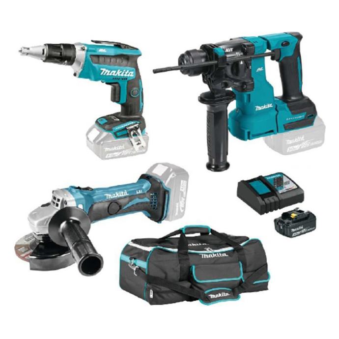 Set akumulatorskih alata koji sadrži aku bušaći čekić DHR183Z, aku kutnu brusilicu DGA452Z, aku odvijač DFS452Z, 1 kom akumulatora 18V 3,0Ah, brzi punjač i veliku torbu. Set je namijenjen suhoj gradnji odnosno "knauferskim" poslovima. Set za knaufere!