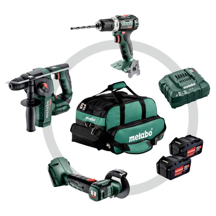 Set akumulatorskih alata koji sadrži aku bušaći čekić BH 18 LTX BL 16, aku kutnu brusilicu CC 18 LTX BL, aku bušilicu/odvijač BS 18 L BL, 2 akumulatora 18V 4,0Ah, punjač ASC 55 i torbu.
