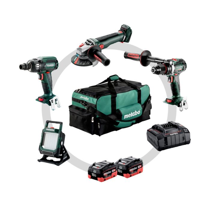 Set akumulatorskih alata koji sadrži aku odvijač SSW 18 LTX 400 BL, aku kutnu brusilicu WB 18 LT BL 11-125 Q, aku bušilicu/odvijač BS 18 LTX BL, aku reflektor BSA 18 LED 4000, 2 akumulatora 18V 10,0Ah, punjač ASC 145 i torbu.