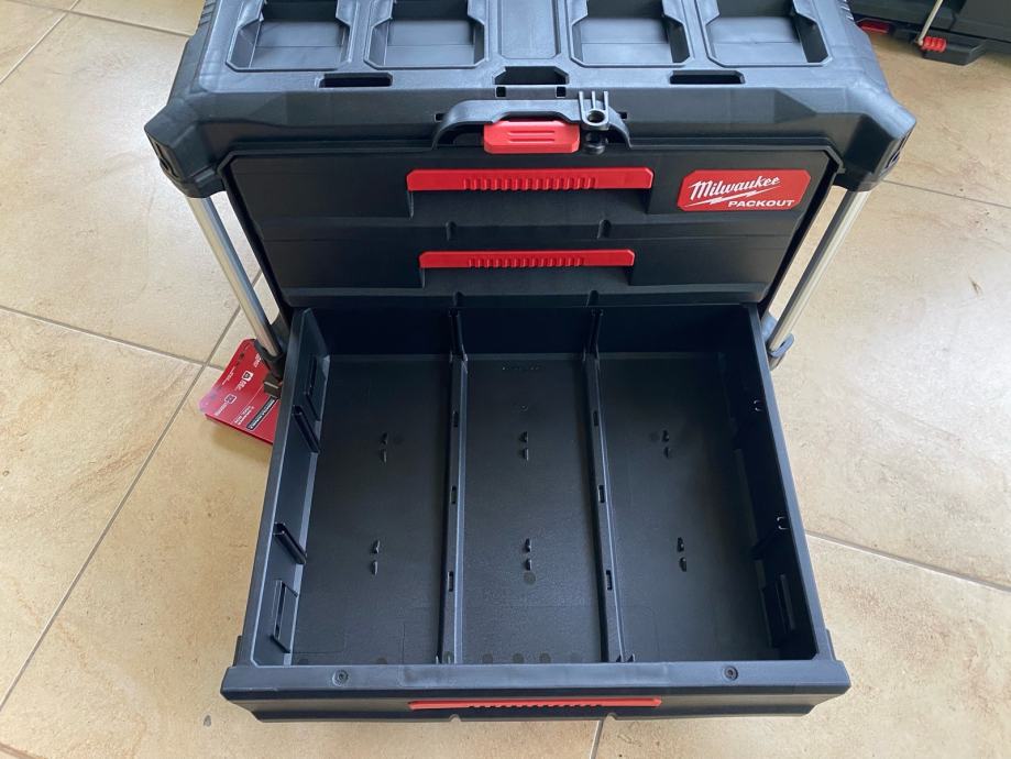 PACKOUT™ kutija s ladicama za alat omogućuje lak pristup vašim alatima, čak i kada je postavljena na dno paketa PACKOUT™.
