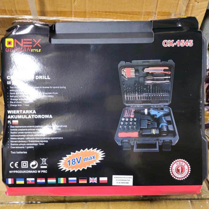 ONEX AKU BUŠILICA 18V S 2 LI-IONSKE BATERIJE I SETOM OD 85 DIJELOVA + LED SVJETLO