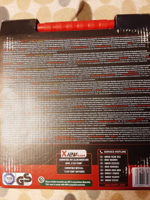 Pribor: 1 baterija (12 V / 2 Ah), 1 punjač (2,4 A), 8 HSS svrdla (1,5 / 2,5 / 3 / 4 / 5 / 6 / 8 / 10 mm), 8 vijaka (PH0, PH1, PH2 / PZ0, PZ1, PZ2 / SL5, SL6), 1 produžni nastavak