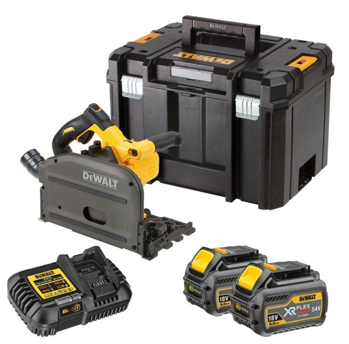 DCS520T2 DeWALT je aku uranjajuća pila. Isporučuje se u setu s dva FLEXVOLT akumulatora kapaciteta 6,0Ah i napona 54V. Opremljen je motorom bez četkica koji radi na 54V - veća brzina, okretni moment, duže vrijeme rada i niža temperatura motora, manje dimenzije i niža stopa kvarova. Pila zadovoljava standarde klasičnih električnih pila ne samo u pogledu snage i performansi, već i najveće preciznosti i ergonomije. Elektronika vam omogućuje da postavite brzinu vrtnje optimalnu za određeni zadatak i svojstva obrađenog materijala. Kod rezanja na vodilici, poseban mehanizam sprječava pomicanje uređaja unatrag u kontaktu s materijalom i tijekom rezanja. To jamči da ćete započeti s rezanjem na točno određenom mjestu. Dobro pristajanje i jednostavna promjena postavki drugi su elementi koji DCS520T2 čine profesionalnim. Čvrsto zatvoren disk u kućištu s nastavkom za spajanje usisnika jamči čistoću rezne linije. Kombinacija s najmanjim FLEXVOLT baterijama i brzim punjačem s visokom strujom punjenja od 8A omogućuje kontinuirani rad. Elektronička kontrola brzine – omogućuje prilagodbu brzine motora svojstvima određene vrste materijala koji se obrađuje Mehanizam protiv povratnog udarca - nemogućnost kretanja stroja unatrag po tračnici sprječava ispadanje diska iz materijala tijekom rezanja uranjanjem Dubina rezanja do 55 mm Zatvorena konstrukcija poklopca - mogućnost priključivanja usisavača ili odsisavanja strugotine i uklanjanje do 90% prašine Disk s 42 zuba – osigurava vrlo precizno rezanje laminata bez rubova TSTAK sistemski kovčeg – praktičan transportni kovčeg kompatibilan s drugim TSTAK-ovima za sigurno skladištenje i transport alata i pribora Radni napon: 54V