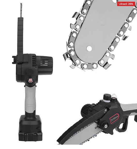 Paket sadrži: Bežičnu pilu, 2x bateriju, punjač, ključ, mač i lanac