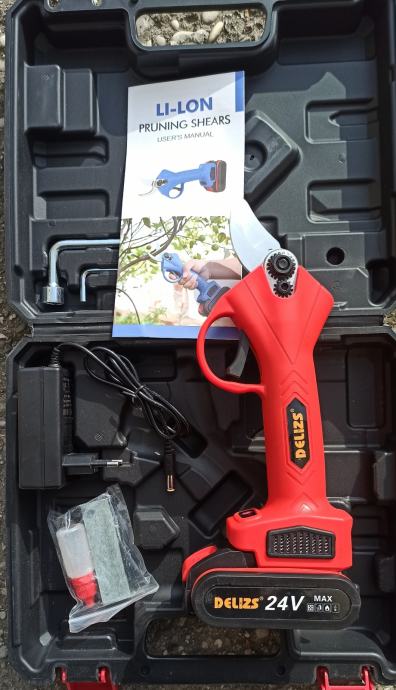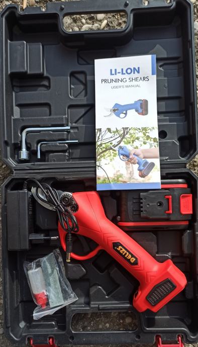 Škare,baterija,punjač i pvc kutija za odlaganje.
