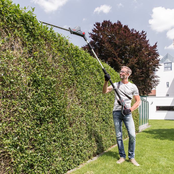 Proturotirajući sigurnosni nož ima duljinu rezanja od 45 cm i debljinu rezanja od 15 mm i osigurava čist rez bez iskošenja ili zapinjanja. Brzo ćete napredovati i uskoro ćete moći uživati u uspjehu svog rada. Akumulatorsketeleskopske škare za živicu HTA 1845 imaju samo 3,45 kg uključujući bateriju i znatno su lakši od mnogih benzinskih škara za živicu. Uređaj s dobrom raspodjelom težine i ergonomskim ručkama omogućuje savršeno uravnoteženo vođenje uređaja i posebno neumorni rad na visokoj živici - čak i kod rada nad glavom!