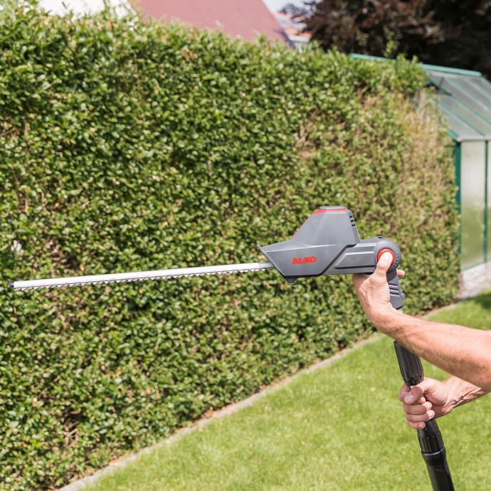 Podrezivanje živice jednostavno je s akumulatorskom teleskopskopskom škare za živicu AL-KO HTA 1845 s dijamantno brušenom oštricom. Visokokvalitetni sigurnosni nož od 45 cm osigurava brz i precizan rez. Fleksibilan u upotrebi zahvaljujući oštrici za rezanje koja se može podesiti (10 koraka) i teleskopskoj osovini. To vam omogućuje da dođete do teško dostupnih mjesta na vrhu živice i osigurate svestrano precizan rez. Vrlo lagane i neovisane od mreže Akumulatorske teleskopske škare za živicu nude vam udoban radijus djelovanja bez zapetljanja kabela i eliminira rizik od slučajnog presijecanja električnog kabela. Škare za živicu mogu se pohraniti na način koji štedi prostor zahvaljujući djeljivoj osovini.
