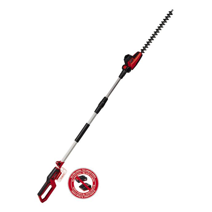 Einhell GC-HH 18/45 Li-T Solo akumulatorske teleskopske škare za živicu član su obitelji Power X-Change. Oštrice na škarama za živicu izrađene su od laserski rezanog i dijamantno brušenog čelika i predviđene su za maksimalnu duljinu rezanja od 410 mm i do 1 400 rezova u minuti. Fleksibilnost pruža glava motora sa 7 postavki nagiba i zakretnom glavnom ručkom. Dodatno je gumirano područje za držanje koje osigurava čvrsto i sigurno držanje, kao i remen koji također potiče ergonomsko rukovanje. Robusni metalni zupčanik dizajniran je za dugi vijek trajanja. Isporučuje se čvrst štitnik oštrice za sigurno skladištenje i lak transport. Ovaj proizvod dolazi bez baterije i bez punjača, oni su dostupni zasebno, npr. kao praktični početni starter setovi. Solo model – isporučuje se bez akumulatora i punjača