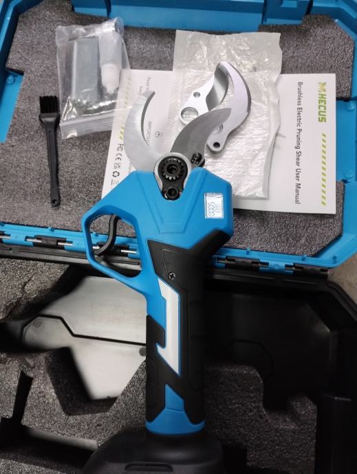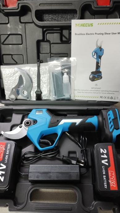 Novi komplet akumulatorskih škara 21V, sa dvije velike baterije punjač i pribor u kutiji sa rezervim noževima.
