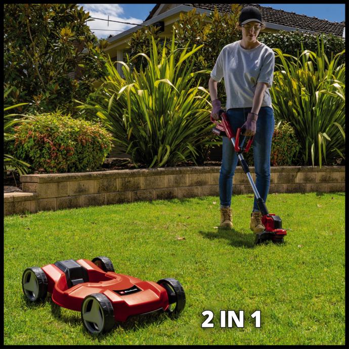Akumulatorski trimer za travu Einhell GE-CT 18/28 Li TC-Solo ispunjava izazove koje predstavljaju rubovi travnjaka, uski dijelovi i rubovi u kućnim vrtovima. Budući da je lagan i jednostavan za rukovanje, ovaj Power-X-Change trimer visokih performansi olakšava rješavanje takvih problematičnih područja. Njegove baterije sadrže litij-ionske ćelije visoke kvalitete i mogu se kombinirati sa svim članovima Power X-Change obitelji. Beskonačno podesiva druga ručka i Softgrip čine ovaj akumulatorski trimer za travu savršeno udobnim za korištenje. S druge strane, teleskopska duga ručka je individualno podesiva po visini kako bi odgovarala visini svakog korisnika. Osim što ima 3 postavke nagiba, glava motora također se može rotirati za 180° za fleksibilno i jednostavno rezanje okomitih površina i rubova travnjaka. Štitnik za cvijeće štiti biljke i drveće od oštećenja dok trimer radi. Koristeći kolica za košnju koja se isporučuju s ovim proizvodom, možete pretvoriti ručni trimer u gradsku kosilicu s 2 postavke, aksijalnim podešavanjem visine košnje od 35 mm do 55 mm. Kolica za košnju imaju sustav klika za jednostavnu pretvorbu bez alata od ručnog trimera do gradske kosilice. Isporuka uključuje glavu trimera (5m) s automatskim uvlačenjem konopa. Ovaj proizvod dolazi bez baterije i punjača. Ovi artikli su dostupni zasebno, npr. kao praktičan Power X-Change starter set. Za rad ovog bežičnog trimera za travu potrebna je jedna baterija od 18 V PXC. Solo model – isporučuje se bez akumulatora i punjača