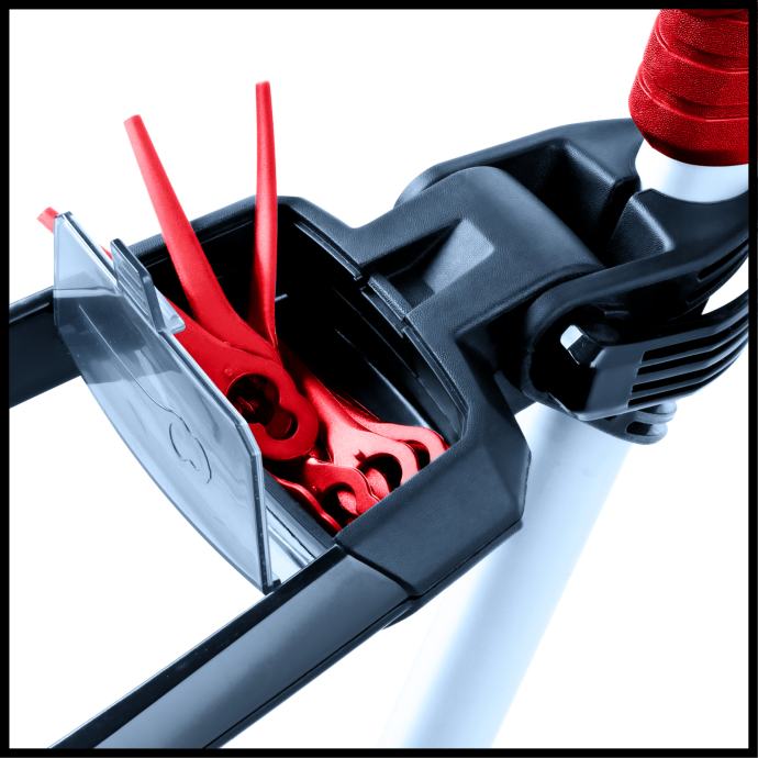 Akumulatorski trimer za travu GE-CT 18 Li (1x 2,5 Ah) snažan je uređaj koji osigurava njegovan travnjak gdje god kosilica ne može doseći. Kao član obitelji Einhell Power X-Change, aku trimer za travu može se koristiti bežično i fleksibilno za produžene radne operacije neovisne o električnoj mreži. Aku trimer za travu isporučuje se u praktičnom kompletu s baterijom Power X-Change od 2,5 Ah i punjačem. Trenutačno stanje napunjenosti također se može očitati na prvi pogled na indikatoru razine baterije s tri LED diode. Kontinuirano podesiva teleskopska drška aku trimera za travu prilagođava se svakoj veličini tijela i osigurava udobno rukovanje. Zahvaljujući mekanom rukohvatu, kontinuirano podesivoj dodatnoj ručki s integriranim odjeljkom za 20 noževa i glavi motora koja se može rotirati +/- 90° i naginjati 5 puta, mogu se odraditi čak i teške radne situacije kao što su okomite površine i rubovi travnjaka bez napora. GE-CT 18 Li (1x 2,5 Ah) je opremljen zaštitom za cvijeće, ukrasno bilje i druge osjetljive predmete. Opseg isporuke uključuje i 20 robusnih plastičnih noževa.