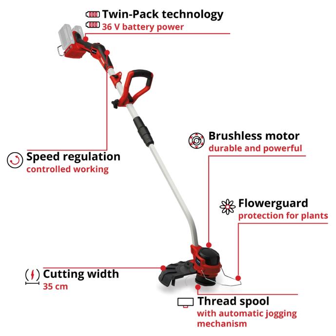 S Einhell Professional akumulatorskim trimerom za travu GP-CT 36/35 Li BL-Solo svaki vrtlar ima praktičnog i provjerenog pomoćnika u spremištu za alat. Bilo da podrezujete rubne trake ili oblikujete travnjak, aku trimer radi brzo i snažno zahvaljujući 2-stupanjskom upravljanju brzinom. Član je Power X-Change obitelji. Baterije se mogu koristiti u svim uređajima u ovoj seriji sustava. Za rad aku trimera za travu potrebne su 2 baterije od 18 V. Uređaj pokreće Einhell PurePOWER motor bez četkica. Ovaj motor bez četkica nudi veću snagu i dulje vrijeme rada od konvencionalnih motora s karbonskim četkicama. Nakon online registracije ostvarujete 10 godina jamstva na motor bez četkica. Dvostruko savijena aluminijska drška osigurava savršenu ravnotežu pri radu. Zahvaljujući rastavljivoj dršci transport je jednostavan, a skladištenje štedi prostor. Podesiva dodatna ručka opremljena je brzim otpuštanjem. Rezna nit se automatski dozira pomoću mehanizma za automatsko doziranje i nudi širinu rezanja do 35 cm. Značajke poput trake za nošenje čine bežični trimer za travnjak svestranim i udobnim pomoćnikom u vrtu. Štitnik za biljke osigurava potrebnu sigurnosnu udaljenost od cvijeća i ukrasnog bilja i tako čuva prekrasan izgled vrta. Isporuka ne uključuje bateriju ili punjač, ali oni su dostupni odvojeno.