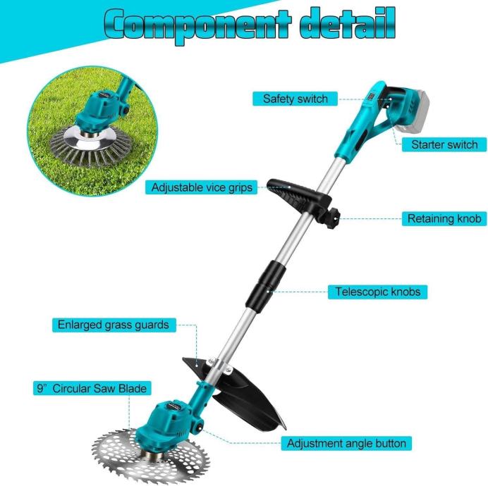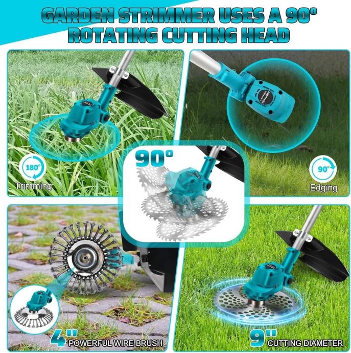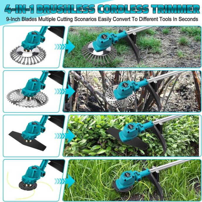 【4 u 1 bežični trimer】Bežični električni komplet trimera dolazi s 4 u 1 oštricom trimera, 1 četkom za suzbijanje korova, 2 oštrice od nehrđajućeg čelika i 2 okrugle oštrice te 1 niti trimera. Žičani kalem je prikladan za košnju meke trave, okrugli noževi od manganskog čelika za rezanje debljih grana grmlja, a noževi od nehrđajućeg čelika za rezanje travnjaka, korova i malog grmlja.